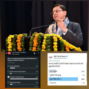 देश के आपदा प्रभावित राज्यों के मुख्यमंत्रियों के कामकाज पर आयोजित टाइम्स ग्रुप के सर्वे में उत्तराखंड के मुख्यमंत्री पुष्कर सिंह धामी ने शीर्ष स्थान हासिल किया है। देश के आपदा प्रभावित राज्यों के मुख्यमंत्रियों के प्रदर्शन को लेकर नवभारत टाइम्स ने हाल ही में एक ऑनलाइन सर्वे कराया। सवाल था “आपदा प्रभावित राज्यों में सबसे बेहतर काम करने वाले मुख्यमंत्री कौन हैं?” इस सर्वे में चार नाम शामिल थे उमर अब्दुल्ला, सुखविंदर सिंह सुक्खू, पुष्कर सिंह धामी और भगवंत मान।