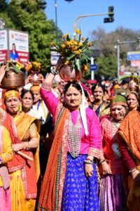 महोत्सव के शुभारंभ अवसर पर आयोजित भव्य शोभा/ कलश यात्रा में उत्तराखंड की समृद्ध लोक संस्कृति और परंपराओं की अद्भुत झलक देखने को मिली। कार्यक्रम की शुरुआत शोभा यात्रा के साथ हुई, जिसका नेतृत्व सेवा संकल्प फाउंडेशन की संयोजक एवं फाउंडर ट्रस्टी श्रीमती गीता धामी ने कलश थामकर किया।